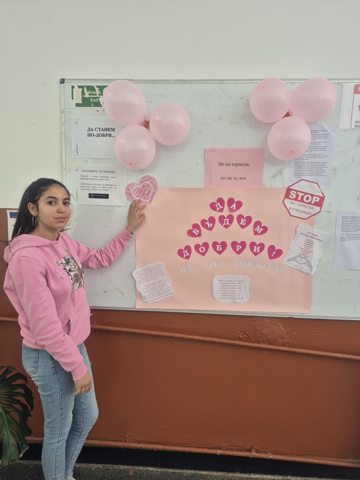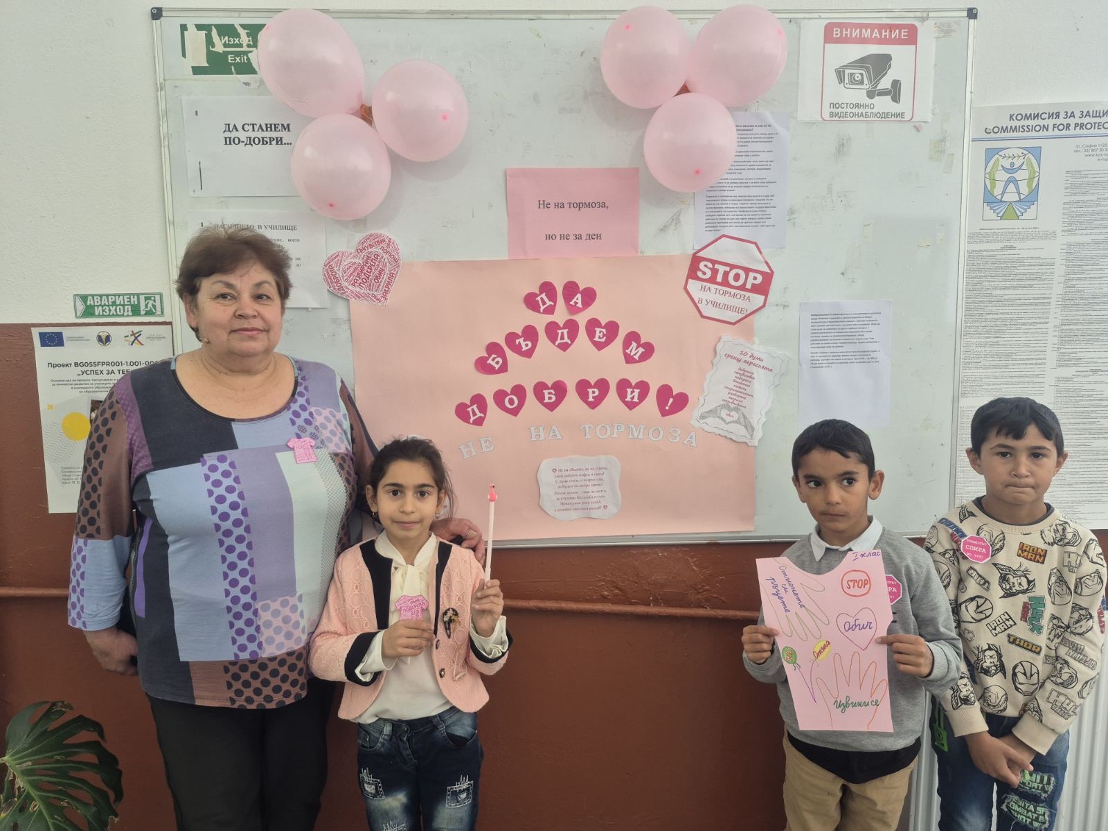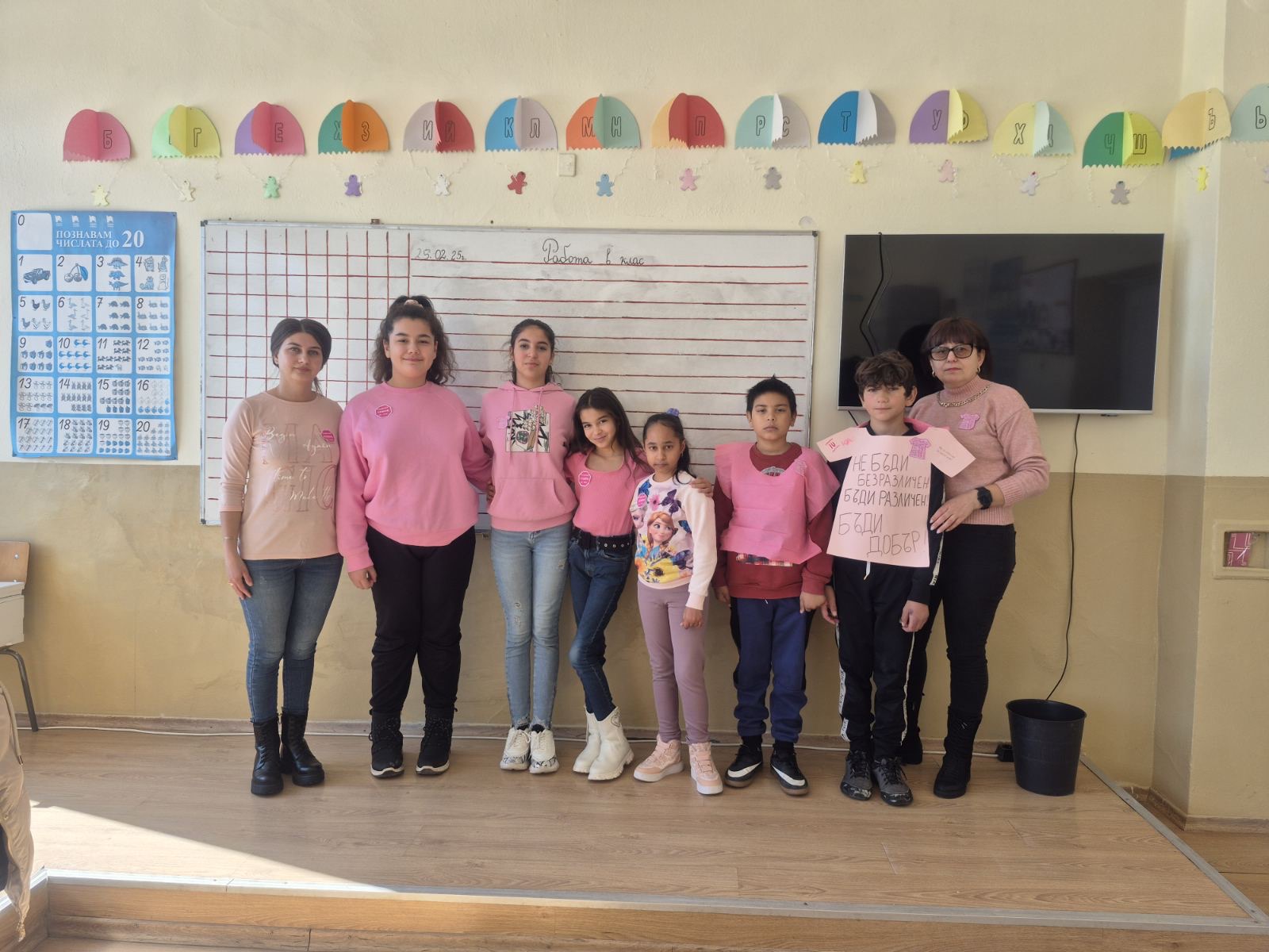 Всички ученици и учители казаха "Не на тормоза в училище", закичвайки се с розови фланелки – стикери.  В беседи и разговори те обсъдиха проблемите за тормоза в училище и семейството, за небходимостта да бъдем съпричастни и да не затвяряме очите си, когато някой е подложен на насилие и унижение.